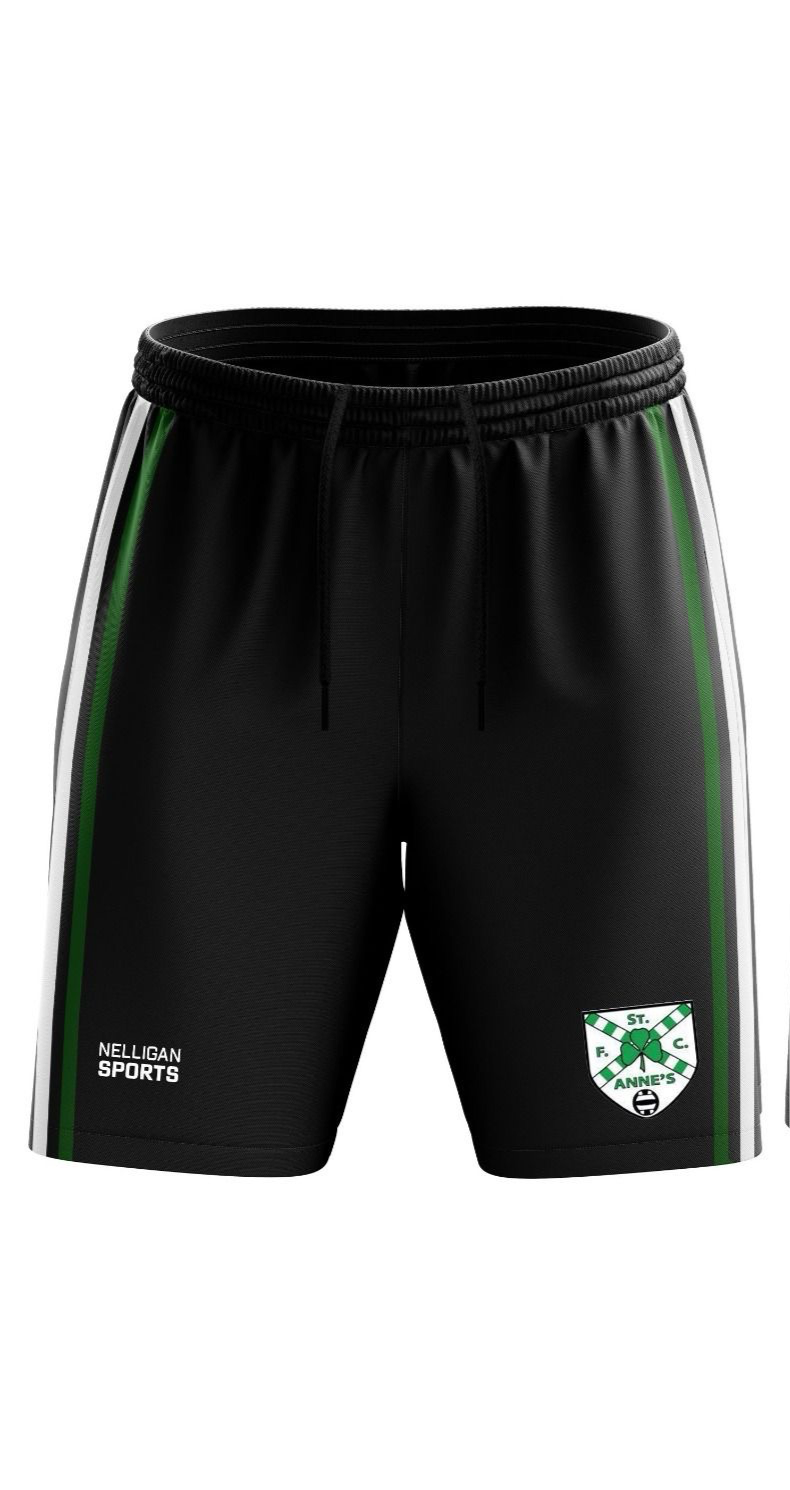 Cool mesh gym shorts. Black with green & white side stripes, team crest, 2 zip pockets